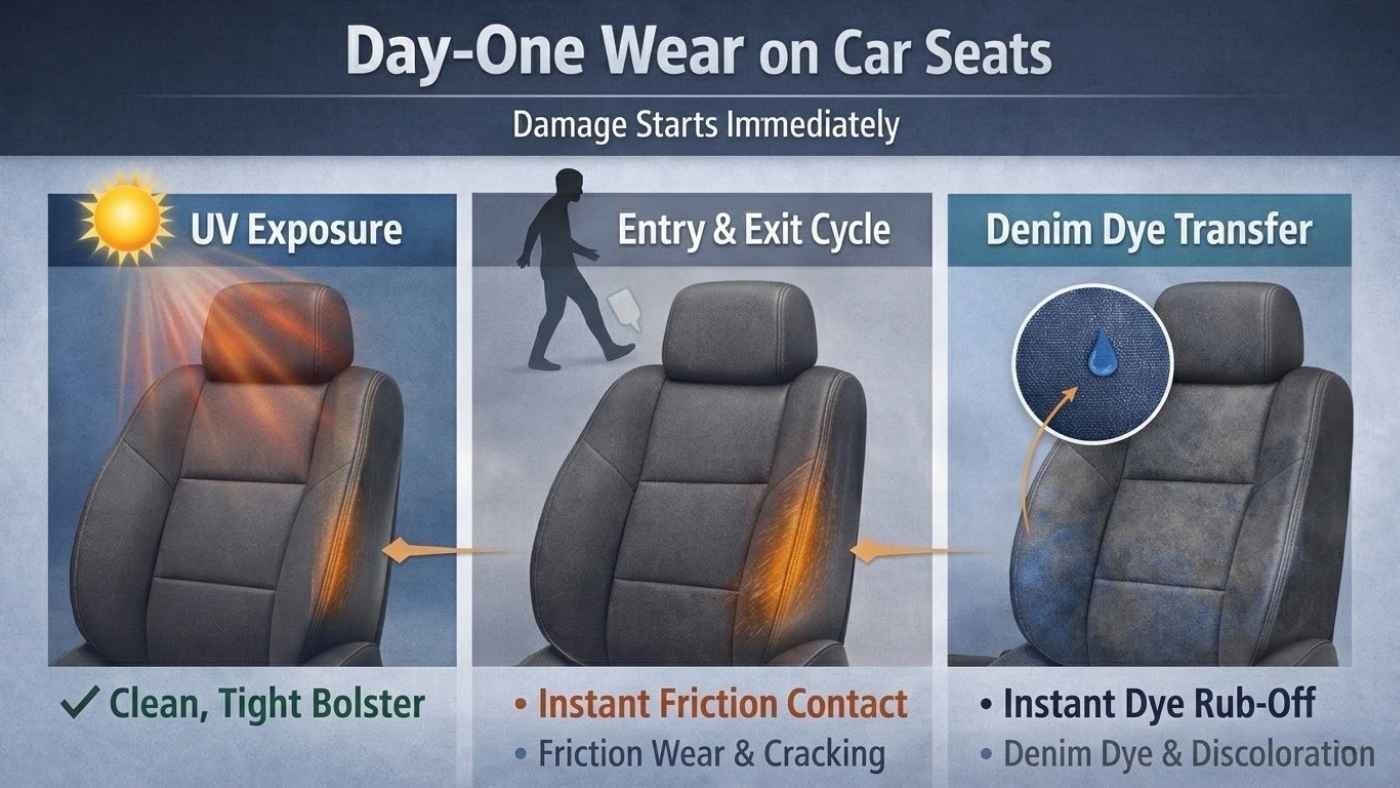 Most seat degradation on new vehicles is invisible for the first few months. The two processes that start immediately and compound silently are UV exposure and dye transfer.